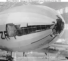 USS Shenandoah was the first of four United States Navy rigid airships. It was constructed during 1922–1923 at Lakehurst Naval Air Station, and first flew in September 1923. It developed the U.S. Navy's experience with rigid airships and made the first crossing of North America by airship. On the 57th flight,[2] Shenandoah was destroyed in a squall line over Ohio in September 1925.[3]