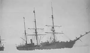 ![]() Thetis (center) with Bear (left) in ice in 1884 during their search for the Greely Expedition. | |