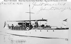 Traveler was built as a civilian motorboat in 1914 by the Mathews Boat Company at Port Clinton, Ohio. The U.S. Navy acquired Traveler from her owner, Mr. John D. Meyers of Miami, Florida, on 5 May 1917 for use as a patrol boat during World War I. She was commissioned on 14 July 1917 as USS Traveler (SP-122).