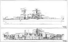 She was armed with a main battery of eight 16 in /45 caliber Mark 1 guns in four twin-gun turrets on the centerline,[lower-alpha 1] two forward and two aft in superfiring pairs. The secondary battery consisted of sixteen 5-inch (127 mm)/51 caliber guns, mounted individually in casemates clustered in the superstructure amidships. She carried an anti-aircraft battery of eight 3-inch (76 mm)/50 caliber guns in individual high-angle mounts. As was customary for capital ships of the period, she had a 21 in (533 mm) torpedo tube mounted in her hull below the waterline on each broadside. West Virginia's main armored belt was 8–13.5 in (203–343 mm) thick, while the main armored deck was up to 3.5 in (89 mm) thick. The main battery gun turrets had 18 in (457 mm) thick faces on 13 in (330 mm) barbettes. Her conning tower had 16 in (406 mm) thick sides.[2][3]