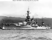On 2 August, Wyoming was in Balboa in the Canal Zone, where she picked up Rear Admiral Rodman and a commission traveling from Peru back to New York. She arrived in New York on 19 August and rejoined the Atlantic Fleet. There, she became the flagship of Admiral Hilary P. Jones, the commander of the Atlantic Fleet. Wyoming spent the next three and a half years on the normal routine of winter fleet exercises off Cuba, followed by summer maneuvers off the east coast of the US. Throughout the period, she served as the flagship of Vice Admirals John McDonald, Newton McCully, and Josiah McKean in the Scouting Fleet. In the summer of 1924, she conducted a midshipman training cruise to Europe, and stopped in Torbay, Great Britain, Rotterdam in the Netherlands, Gibraltar, and the Azores.[2] In January and February 1924, the Navy conducted Fleet Problem II, III, and IV concurrently. During the FP III maneuvers, Wyoming, her sister Arkansas, and the two Florida-class battleships stood in for the new Colorado-class battleships.[10] During the FP IV portion of the maneuvers, Wyoming served in the "Blue" force, which represented the US Navy. She was attacked by "Black" aircraft, but the umpires judged Wyoming's anti-aircraft fire and the escort fighters provided by Langley to have effectively defended the fleet.[11]