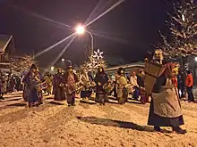 The Ubersitz is a traditional custom in Hasli, Bernese Oberland, Switzerland. On Christmas day, at nightfall, schoolboys begin with Treichlen, walking through the villages in small troops, sounding giant cow-bells. The following nights, the boys are joined, and later replaced, by adult men. The Trychling culminates on 30 December (or the last workday before that date), with the Ubersitz in Meiringen. On this day, the Treichler are carrying frightening masks (except for the people of Unterbach and Hasliberg who remain unmasked)