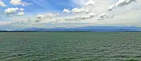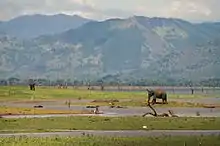 The habitat surrounding at the reservoir includes marshes, the Walawe river and its tributaries, forests and grasslands.[2] Dead trees standing in the reservoir are visual reminders of the extent of forest cover before the construction of the Udawalawe Dam. Green algae, including Pediastrum and Scenedesmus spp., and blue green algae species such as Microsystis, occur in the reservoir. Areas of open grassland are abundant as a result of former chena farming practices.[1] There is a plantation of teak beyond the southern boundary, below the dam, which was planted before the declaration of the park. Species recorded from the park include 94 plants,[2] 21 fish, 12 amphibians, 33 reptiles, 184 birds (33 of which are migratory), and 43 mammals. Additionally 135 species of butterflies are among the invertebrates found in Udawalawe.