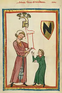 Since his grandfather was a guardian of the young king Henry (VII), Ulrich is often grouped with the other Minnesänger associated with Henry's court, Burkhart von Hohenfels and Gottfried von Neifen.[7] The three have been called "a new Swabian school" of Minnesang,[8] although they belonged to different generations.[9] They were influenced by the satirical poems of Neidhart.[8]