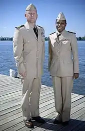 The Service Khaki uniform today is reserved for officers and enlisted sailors at chief petty officer and above. Colloquially referred to as "Peanut Butters" (due to the color), it is a short-sleeved khaki button-up shirt and matching trousers, worn with a gold belt buckle. The shirt features two front flap pockets and an open collar. Ribbons are worn above the left pocket of the shirt, with the warfare insignia above them. A nametag may be worn above the right pocket, and rank insignia is worn on the collar. The regulations for ribbons state the highest three awards, or all ribbons can be worn at once. Headgear consists of either a combination cap with a khaki cover or a khaki garrison cap.[14] Currently black and brown oxford shoes are authorized for all officers and CPOs,[15] though traditionally brown shoes are worn only by aviators. Females are authorized to wear the same over-blouse as junior enlisted sailors. The uniform is also worn by cadet officers and cadet chief petty officers in the Navy Junior ROTC.[16]