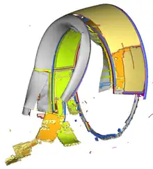 Interior surfaces of the fan case and the remains of the inlet duct showed scratches and gouges that were in a spiral pattern across the fan case and front flange onto the inlet duct to the broken edge of the duct on the inboard area of the nacelle. The examination of the fan case showed that there were three distinct patterns of tracks along the flow path that appeared to spiral forward from the plane of the fan blades' leading edge across the A-flange on to the inlet duct's inner barrel.[12]