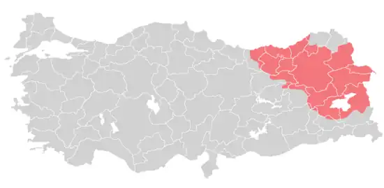 Western Armenia refers to an undefined area, now in eastern Turkey, that had significant Armenian population prior to the Armenian genocide of 1915.[154][155] As a result of the genocide, officially no Armenians live in the area today.[156] However, at least two distinct groups of Armenian origin reside in the area. Hemshin peoples, an islamisized group with Armenian ethnic origin,[157][158] live in the Black Sea coast, particularity in the Rize province.[159] Another group, "Hidden Armenians", live throughout Turkey, especially the eastern parts of the country. Many of them have been assimilated by Kurds. It is impossible to determine how many there are due to the fact that they keep their identity hidden, but estimates range from below 100,000 to millions.[160] Since the Armenian Genocide, the area has been mostly settled by Kurds and Turks,[161] with smaller numbers of Azerbaijanis (near the Turkish-Armenian border)[162] and Georgians and Laz people in the northeastern provinces of Turkey.[163][164]