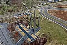 The three memorial spires range from 201 feet (61 m) to 270 feet (82 m) high and appear to be soaring; its array of stainless steel arcs against the sky evokes the image of "contrails of the Air Force Thunderbirds as they peel back in a precision 'bomb burst' maneuver." Only three of the four contrails are depicted, at 120 degrees from each other, as the absent fourth suggests the missing man formation traditionally used at Air Force funeral flyovers.[5]