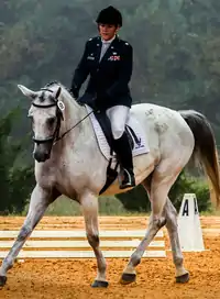 The U.S. Air Force "Equestrian Competition Service Dress Configuration" is a special uniform authorized for wear during formal dressage events sponsored by the United States Equestrian Federation. The equestrian uniform is similar to service dress, but features white riding breeches in lieu of blue trousers. Black gloves, a black helmet, and black riding boots with silver spurs are also worn.