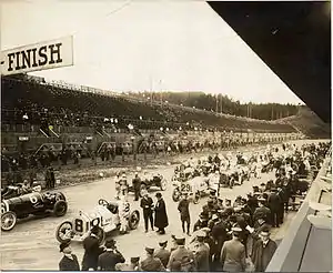 The Grand Prize was not held in 1913, after Long Island's bid was rejected and Savannah refused to provide sufficient prize money. Oval racing on board tracks had taken off in the United States, to the detriment of road racing. For 1914, the Grand Prize and Vanderbilt Cup were staged in Santa Monica, California near Los Angeles, on an 8.4-mile (13.5 km) course, with the start/finish straight along the Pacific Ocean. The field was primarily American entries (twelve, against five European entries), and the Americans dominated, with Eddie Pullen's Mercer winning by over 40 seconds.[11] In 1915, the race shifted to San Francisco, in conjunction with the Panama–Pacific International Exposition. With the outbreak of World War I in Europe, almost all of the drivers and cars were American, except for a few cars imported earlier. The 3.84-mile (6.18 km) course was set up around the Exposition grounds and nearby oval track with a boarded main straightaway. Heavy rain began two hours into the race, covering the circuit in mud from the extensive flower arrangements, and warping the main straight's boards. Dario Resta in a Peugeot cruised to a seven-minute victory, and followed up a week later by winning the Vanderbilt Cup.[12] For 1916, the Grand Prize returned to Santa Monica. The race would be a part of the AAA National Championship, which carried a 4.91-liter displacement limit. Although the limit for the Grand Prize was 7.37 liters, no large-displacement cars would enter. The race was the penultimate round of the championship, with Dario Resta leading Johnny Aitken after his Vanderbilt Cup win. However, both cars would be out before halfway. Although Aitken took over teammate Howdy Wilcox's car for the win, the AAA awarded points only to Wilcox, and Resta took the championship.[13][14]