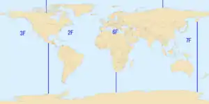 The areas of responsibility of the United States Second (marked "2F"), Third ("3F"), Fourth ("4F"), Fifth ("5F"), Sixth ("6F"), and Seventh ("7F") Fleets in 2009.