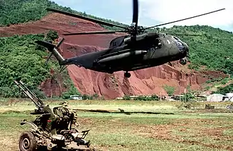 An American Sikorsky CH-53 Sea Stallion helicopter hovers above the ground near an abandoned Soviet ZU-23-2 anti-aircraft weapon during the American invasion of Grenada, 1983.