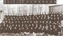 The university was founded as a private institution in 1919.[8] Nankai's scale was relatively small at its inception partly because it received no funding from the government but instead was funded by foreign charitable funds and local entrepreneurs, with only 3 departments (liberal arts, science, and business) and 96 students.[9] It was noted particularly for its courses which were taught in English using foreign curricula and textbooks.[10]