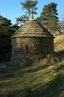 Errwood Hall was the Victorian mansion of the Grimshawe family, built in about 1840 but it is now in ruins. Below Foxlow Edge there is a Spanish shrine, built in 1889 in memory of Miss Dolores (a friend of the Grimshawe family). The shrine is a designated Grade II listed building.[6]