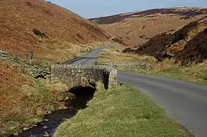The old stone Derbyshire Bridge gets its name from it being at the historic boundary from Cheshire into Derbyshire. The road south out of the Goyt Valley is one-way and crosses the bridge.[3]