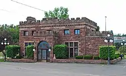 In the 1890s, Meeske replaced the earlier frame structures at the Marquette plant with a complex of sandstone buildings, constructed to resemble small castles. The 42-acre (170,000 m2) complex[4] included warehouses, residences, a tower, and a bottling plant.[3] Meeske retained the German Biergarten landscaping the Rublein had initiated.[3] The structure at the corner of Meeske and US41 was built in 1894,[2] and served as Meeske's home and office,[2] as well as the entrance to the brewery grounds.[3]