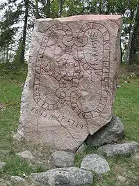 This runestone was also made by Gunnar and is classified as being carved in runestone style Pr1. This is the classification, which is also known as Ringerike style, for those inscriptions that have runic bands that end in serpent or animal heads depicted in profile. In the text there is some question regarding whether the Old Norse words i grati should be translated as meaning "in tears" or "in lament," meaning that Gyríðr composed poetry in mourning her deceased husband.[3] It has been suggested that the inscription Vg 59 in Norra Härene describes another widow who may have composed a lament.[3] U 226 is the only surviving runestone signed by Gunnar, although more than forty other inscriptions have been attributed to him based on stylistic analysis. The runes kunar ik stin for "Gunnarr cut the stone" are carved in a line below the rest of the inscription.