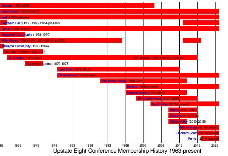 Waubonsie Valley High School, located in Aurora, joined in 1991. West Aurora High School left in 1997 to join the DuPage Valley Conference. Newly opened schools Bartlett High School and Neuqua Valley High School located in Naperville joined in 1998. St. Charles High School split into St. Charles East and St. Charles North in 2000, with St. Charles North joining in 2001. South Elgin High School joined upon opening in 2005, preemptively taking DeKalb's place, as they left in 2006. Batavia High School and Geneva High School joined in 2010 following the dissolution of the Western Sun Conference, and joined newly opened Metea Valley High School in Aurora to bring conference membership to 14 schools. Lake Park left the conference to join the DuPage Valley Conference for the 2013–2014 season and was replaced by West Chicago. Glenbard East High School and West Aurora High School will return to the Upstate Eight Conference for the 2014-2015 athletic season, leaving the DuPage Valley Conference. For the 2015-2016 athletic season, Metea Valley High School, Neuqua Valley High School, and Waubonsie Valley High School leave the Upstate Eight conference for the DuPage Valley Conference. Starting in the 2018–2019 school year, St. Charles North, St. Charles East, Batavia, and Geneva will leave for the newly formed DuKane Conference along with Wheaton North, Wheaton Warrenville South, Glenbard North, and Lake Park from the DuPage Valley Conference while new member, Glenbard South High School joins in and the River and Valley Divisions became eliminated.
