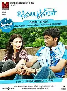 Uthamaputhiran (transl. Ideal Son) is a 2010 Indian Tamil-language romantic action comedy film directed by Mithran Jawahar. A remake of the 2008 Telugu film Ready, it stars Dhanush and Genelia, reprising her role from the original version;[1] the supporting cast includes Vivek, K. Bhagyaraj, Ashish Vidyarthi and Jaya Prakash Reddy (who was also part of the original film) among others with Shriya Saran in a cameo. The film received mixed to positive reviews from critics,[2] ended up as a commercial success among 2010 Deepavali releases along with Mynaa.[3] The film was dubbed into Hindi as Rakhwala No. 1 in 2012.[4]
