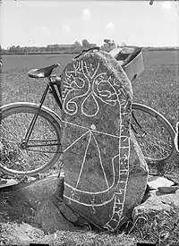 The inscription on Vs 17 consists of runic text in the younger futhark on a serpent that encircles a ship that is on a granite stone which is 1.4 meters in height. Other runic inscriptions from the Viking Age which depict ships include DR 77 in Hjermind, DR 119 in Spentrup, DR 220 in Sønder Kirkeby, DR 258 in Bösarp, DR 271 in Tullstorp, DR 328 in Holmby, DR EM85;523 in Farsø, Ög 181 in Ledberg, Ög 224 in Stratomta, Ög MÖLM1960;230 in Törnevalla, Sö 122 in Skresta, Sö 154 in Skarpåker, Sö 158 in Österberga, Sö 164 in Spånga, Sö 351 in Överjärna, Sö 352 in Linga, Vg 51 in Husaby, U 370 in Herresta, U 979 in Gamla Uppsala, U 1052 in Axlunda, and U 1161 in Altuna.[1] Three stones, the Hørdum and Långtora kyrka stones and U 1001 in Rasbo, depict ships but currently do not have any runes on them and may never have had any.[1]