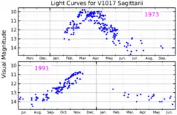 ![]() Visual band light curves for the 1973 and 1991 eruptions of V1017 Sagittarii, adapted from Salazar et al. (2017)[1] | |