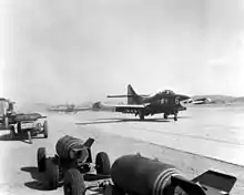 In 1949, VMF-115 was the first Marine Corps squadron equipped with Grumman F9F-2 Panther jets, and on November 20, 1950, the first Marine squadron to carrier qualify all 18 pilots aboard the USS Franklin D. Roosevelt.[3] The squadron then deployed to Pohang, Korea, for combat operation in February 1952. In late-June 1952 they participated in the attack on the Sui-ho Dam. Throughout the Korean War, VMF-115 expended more ordnance than any other Marine jet fighter squadron. A total of 15,350 flight hours were logged on 9,250 combat sorties with a price of 19 aircraft lost. Six pilots were lost with their aircraft in a single day and a total of 14 pilots were killed in action. Close air support was provided by VMF-115 in battles such as Bunker Hill, The Hook, Reno, Carson-Elko, Vegas, Berlin, East Berlin, and the Marines famous battle at the Chosin Reservoir.