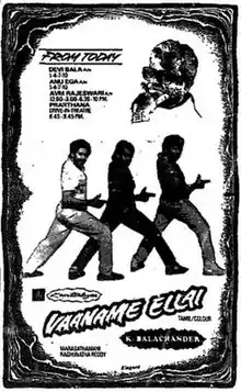 After the release of Ek Duuje Ke Liye (1981), Balachander was upset on learning of numerous people wanting to commit suicide the way it happened in the film. Lakshmi Vijayakumar, a psychiatrist, suggested he make a film showing "the thought of suicide in a positive light — to go through struggle, but overcome it and realise that life is worth living". This laid the foundation for Vaaname Ellai.[3] The film marked the acting debut of actors Madhan Bob and Dhamu as a comedian who went on to become popular.[4][5] Bob had been recommended to Balachander by his father's friend.[6]