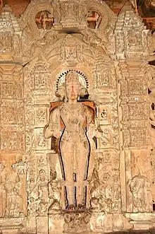 The Lakshmana Temple of Khajuraho is dedicated to Vaikuntha Chaturmurti. Though three-faced, an inscription in the temple suggests that it should be considered four-faced. It also records a legend where Kapila and other demons conjoined together in a single form and were blessed by Brahma that only someone in the same form could slay them so Vishnu took the form of Vaikuntha Chaturmurti.[12][33] The presence of the Lakshamana Temple in Khajuraho suggests worship in the Chandela kingdom in the 10th century.[24]