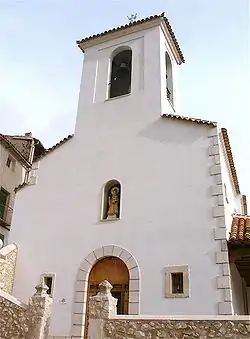 At the foot of the church is the choir with wooden beams and, outside, the tower stands on a door arch. In the center of this facade a niche houses a stone sculpture of the Virgen de la Blanca.