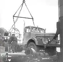 General manager Kytölä travelled to France and West Germany in 1947 and early 1948 to buy military surplus materials from the Western Allies. He bought 425 White Motor Company M2 Half-Track vehicles, 186 lorry engines, 304 Cadillac V8 engines, 4 Mack ED diesel engines, 2 Hercules Diesel DFXE engines, 11,000 GMC wheels and one 45-tonne-capacity trailer. Trading was organised through the Ministry of Supply and the first delivery arrived in March 1948. The White Half-Track vehicles were without armour; Kytölä's idea was to equip them with superstructures for field or forest clearing, or to convert them into Four-wheel drive lorries by replacing the tracks with a conventional rear axle.[16] In total, VAT sold 359 units as half-tracks, and 60 were converted into 4×4 or 4×2 vehicles. These lorries were sold as Vanaja VaWh. Some of the half-track vehicles were scrapped for parts; the last was sold in 1952.[17]