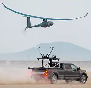The initial VA001 was powered by a off-the-shelf engine driving a pusher propeller, and was controlled by a Piccolo autopilot.[1] Weighing up to 600 lb (272 kg), it has a 36 ft (11 m) wing span and a 55-gallon (208-litre) fuel capacity.[1] It has a projected endurance of up to 10 days at 55 kn (102 km/h) and up to 15,000 ft (4,600 m), and burning 1 lb (450 g) of jet fuel per hour.[1] The VA001 was launched using a sled and pulled by a towline attached to a pickup truck. It lands at 40 kn (74 km/h) on a single center wheel.[1] The Vanilla UAV uses a pickup truck launcher for takeoff.