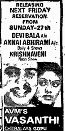 Vasanthi was released on 2 December 1988.[4] The Indian Express wrote, "Chitralaya Gopu [..] directs the film interspersing seriousness with humour".[1] S. S. Chandran won the Cinema Express Award for Best Comedy Actor.[5]