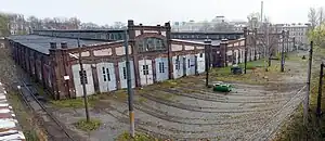 The three buildings of the Vasileostrovsky trampark’s depot were built in brick forms of Art Nouveau, they relate to the early models of usage of progressive ferroconcrete and steel constructions. Each of the three buildings of the depot is bisected into the so-called "polusaray" (semi-shed) by a cross main wall with 8 passages. Two residential buildings (built in 1908 and 1915) form the street frontage. Three carload sheds have an internal partition on semisheds. There are various designs of overlappings in each of the semisheds. Semisheds 1 and 2 have a ferroconcrete design of overlappings. Semished 3 has a unique ferroconcrete design of overlappings. Semisheds 4, 5, 6 have a design of overlappings with application of pig-iron beams.