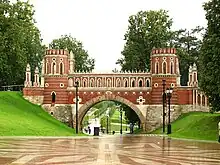 Bazhenov, at least in the first half of Catherine's reign, perfectly understood her taste and stylistic program, that of Age of Enlightenment rather than of Neoclassicism.[31] During the 1775 celebrations of the Treaty of Küçük Kaynarca on the Khodynka Field, Bazhenov "turned imitation of English Gothic Revival into an attempt to create a universal stylistic language for Russian architecture combining typical elements of medieval buildings of both East and West, motifs from Antiquity and pure fantasy."[31] This ephemeral work paved way to Catherine's decision to build two[32] imperial palaces in Moscow suburbs (in 1775 she lived in a temporary wooden building in Kolomenskoye).[32] The lesser Petrovsky Castle on the road to Saint Petersburg was awarded to Kazakov,[32] the larger Tsaritsyno to Bazhenov.[32][33]