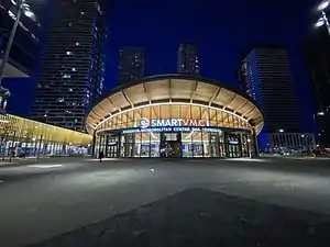 SmartVMC Bus Terminal (previously known as SmartCentres Place Bus Terminal) is a YRT bus terminal north of the station to the west side of Millway Avenue,[27] outside the station's fare-paid area.[28][29] Diamond Schmitt Architects designed the terminal in a horseshoe shape. The building features open architecture that can be accessed from every direction. There is a passenger kiss-and-ride area on Millway Avenue and an underground walkway linking it with the subway station and Viva rapidway station on Highway 7.[27][30]