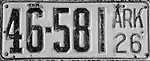 1926 | Embossed black serial on white plate with border line; "ARK 26" at right | none | 123-456 | ||