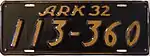 1932 | Embossed slanted gold serial on black plate with border line; slanted "ARK 32" centered at top | none | 123-456 | 1 to approximately 170-000 | |