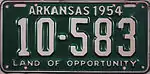 1954 | Embossed white serial on dark green plate with border line; "ARKANSAS 1954" centered at top | "LAND OF OPPORTUNITY" at bottom | 123-456 | 1 to approximately 393-000 | |