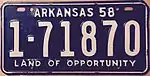 1958 | Embossed white serial on dark blue plate with border line; "ARKANSAS 58" centered at top | "LAND OF OPPORTUNITY" at bottom | 1-12345 10-12345 |