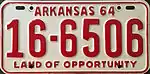 1964 | Embossed red serial on white plate with border line; "ARKANSAS 64" centered at top | "LAND OF OPPORTUNITY" at bottom | 1-123456 10-12345 |