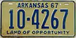 1967 | Embossed blue serial on reflective white plate with border line; "ARKANSAS 67" centered at top | "LAND OF OPPORTUNITY" at bottom | 1-123456 10-12345 |