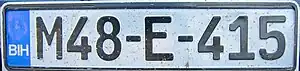 Bosnia and Herzegovina vehicle registration plates have held their current form since 2 February 1998.[1] Currently the Bosnia and Herzegovina (BiH) vehicle registration plate format consists of seven characters: five numbers and two letters arranged in the following order: X00-X-000 (taxis: TA-000000). The plates are uniform across the country and do not denote the place (town, municipality, canton, or entity) where the vehicle is registered, as was the case prior to 1998. Likewise the plates do not contain any heraldic symbols. The plates use only letters which are represented equally in Latin and Cyrillic script (A, E, O, J, K, M, T).