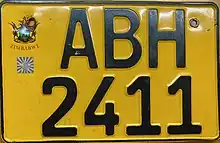 They were introduced before independence from Britain, when the country was known as Rhodesia and were not changed by the government following independence in 1980. For private vehicles, characters are in black on a yellow background, although white backgrounds were introduced in 2006. For commercial vehicles, characters are in red on a white background. 2006 number plates sometimes show Zimbabwe national symbols, such as the coat of arms. The plates are made of metal. Military plates are white-on-black, the last two numbers denote the year, so 123 AB 81 would be 1981.