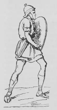 Velites (Latin: [ˈweːlɪteːs]; SG: veles) were a class of infantry in the Roman army of the mid-Republic from 211 to 107 BC. Velites were light infantry and skirmishers armed with javelins (Latin: hastae velitares), each with a 75cm (30 inch) wooden shaft the diameter of a finger, with a 25cm (10 inch) narrow metal point, to fling at the enemy.[1] They also carried short thrusting swords, or gladii, for use in melee. They rarely wore armour as they were the youngest and poorest soldiers in the legion and could not afford much equipment. They did carry small wooden shields called parma for protection, and wore headdresses made from wolf skins so their brave deeds could be recognized.[2][3] The velites were placed at the front partly for tactical reasons, and also so that they had the opportunity to secure glory for themselves in single combat.[2]