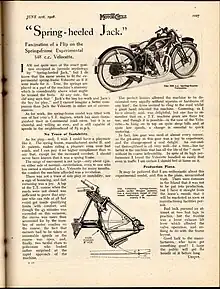 The Velocette Spring Heeled Jack is a motorcycle built by Velocette at Hall Green, Birmingham, England. This famous works KSS 350cc, sprung frame, Velocette was a prototype and as such the only one ever built by the Hall Green factory. The bike was christened Spring-heeled Jack by Harold Willis, and has been known by that name ever since by enthusiasts all over the world. First registered in May 1927, the motorcycle was a one-off built for Alec Bennett, the factory's number one rider, and was unsuccessfully tried in the practice sessions of the 1928 Isle of Man TT. This bike retained the factories hand change mechanism although the positive stop foot change was to be seen on the other race bikes of that year, and also had a straight through exhaust pipe.