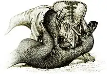 The "Fighting Dinosaurs" specimen, found in 1971, preserves a Velociraptor mongoliensis and Protoceratops andrewsi in combat and provides direct evidence of predatory behavior. When originally reported, it was hypothesized that the two animals drowned.[6] However, as the animals were preserved in ancient sand dune deposits, it is now thought that the animals were buried in sand, either from a collapsing dune or in a sandstorm. Burial must have been extremely rapid, judging from the lifelike poses in which the animals were preserved. Parts of the Protoceratops are missing, which has been seen as evidence of scavenging by other animals.[43] Comparisons between the scleral rings of Velociraptor, Protoceratops, and modern birds and reptiles indicates that Velociraptor may have been nocturnal, while Protoceratops may have been cathemeral, active throughout the day during short intervals, suggesting that the fight may have occurred at twilight or during low-light conditions.[44]