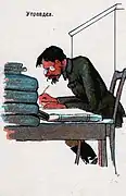 In 1922, the newspaper's employees came up with the idea of creating a satirical magazine Skorpion, which would criticize such phenomena as petty bourgeoisie, philistinism, formalism, and bureaucracy. The artists of Skorpion were A. Ivanov and V. Romov. Romov's cartoons, published in the headings "Nep Grimaces" and "Grimaces of life", reflected the characteristic types of that era: a smug Nepman and combine dealers who used "air" and "smoke" as profit.[1]