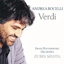 Verdi is Italian tenor Andrea Bocelli's seventh studio album and fourth classical album, of Verdi's most famous arias, released in 2000. The Israel Philharmonic Orchestra, conducted by Zubin Mehta, accompanied Bocelli for the album.[1] The album was certified Gold in the US by the Recording Industry Association of America[2] and in Switzerland by IFPI of Switzerland,[3] Platinum in Canada by the Canadian Recording Industry Association,[4] and Double Platinum in the Netherlands by the Nederlandse Vereniging van Producenten en Importeurs van beeld- en geluidsdragers.[5]