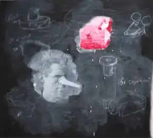 Fisher was best known for his paintings that resemble chalk on a school blackboard, often with incongruous elements added.[3] Fish, in the collection of the Honolulu Museum of Art, is an example these "blackboard paintings".