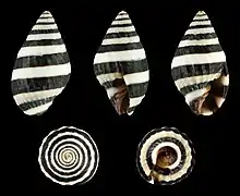 (Original description) The shell is ovate and smooth. It is longitudinally rather obsoletely plicately ribbed, ribs granose towards the base. The whorls are conspicuously painted with alternate blue-black and white zones. The columella is three-plaited. [2]